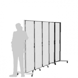 Sistema ESPOSITIVO modulare su ruote della linea Clipper composto da n. 5 pannelli autoportanti con telaio in alluminio e coprifilo plastico, lastra bifacciale in bilaminato plastico, cm 65x193h, e piedi metallici su ruote, cm 4x45.