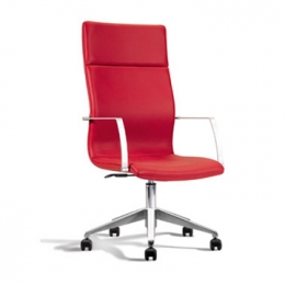 Poltrona direzionale, rivestimento in finta pelle. Colore: pelle nera (PN), pelle bianca (PB). Peso Kg 15. Sedile e schienale in scocca di legno multistrato curvato, con imbottitura in resina poliuretanica espansa. Piastra di supporto non oscillante. Regolazione in altezza del sedile con pistone a gas. Base in alluminio con finitura lucida con ruote in nylon. Braccioli fissi in acciaio cromato. Optional: top rivestiti per braccioli.