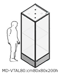 Vetrina espositiva ad ISOLA della linea Argurion a base quadrata con struttura in alluminio e lastre in vetro antinfortunio stratificato. Anta apribile con serratura ad incasso. Controllo passivo dell'umidità (silica gel granulare).