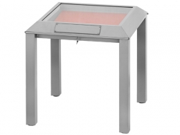 Vetrina espositiva a TAVOLO della linea Testi con struttura in metallo e n. 4 gambe laterali. Piano superiore apribile con vetro stratificato antinfortunio e serratura ad incasso. Vano espositivo con controllo passivo dell’umidità (silica gel granulare) altezza utile teca cm 18.