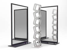 Famiglia di specchi, a parete autoportanti, inclinati, su ruote. Specchi sintetici.Specchi modulari e di grande formato.