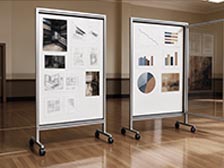 Bacheche autoportanti su ruote modulari per interno. Apertura e chiusura " a pacchetto" istantanea.