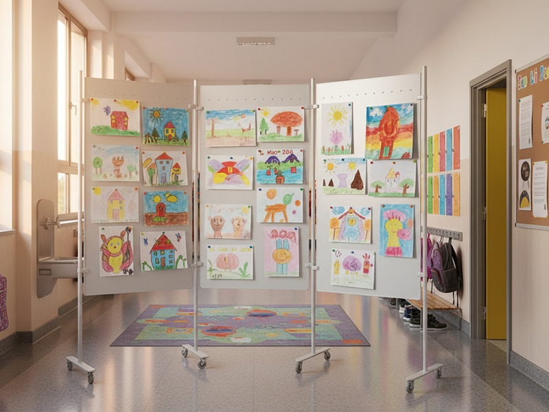 Bacheche espositive autoportanti su ruote per interno con griglie o pannelli. Le bacheche sono adatte per ambienti pubblici: scuole, enti, comuni, sale cinematografiche, teatri, uffici, centri commerciali.