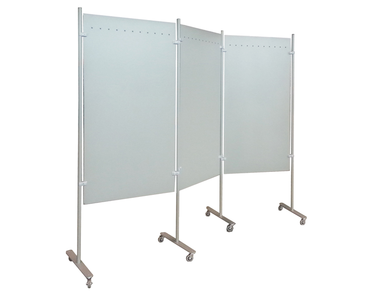 Bacheca modulare composta da n.3 pannelli in lamiera di acciaio pressopiegata e punzonata per magneti e ganci, dimensioni cm 75x150, n.4 piantane metalliche e n.4 piedi metallici dritti su ruote cm 4x45. La composizione comprende ruote pirottanti semplici e con freno. Finitura parti metalliche con polveri epossipoliestere a caldo, colori: grigio alluminio, grigio micaceo, bianco, corten. Ingombro singolo pannello cm 80x45x200h