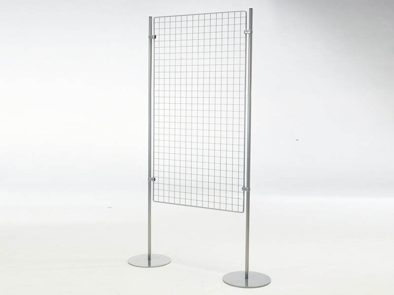 PannelloESPOSITIVO aggiuntivo della linea Expò composto da n. 1 piantana metallica, n. 1 griglia metallica bifacciale, cm 80x150h, e n. 1 piede metallico tondo diam. cm 39.Finitura parti metalliche con polveri epossipoliestere a caldo, colori: grigio alluminio, grigio micaceo, bianco. Ingombro struttura cm 104x200h.