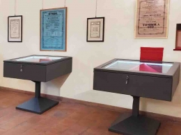 Vetrina espositiva a TAVOLO della linea Testi con struttura in metallo e n. 1 gamba centrale. Piano superiore apribile con vetro stratificato e serratura ad incasso. Vano espositivo con controllo passivo dell’umidità (silica gel granulare).