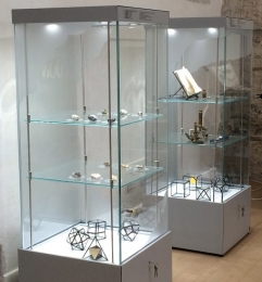 Vetrina espositiva ad ISOLA su ruote pivottanti della linea Theca a base quadrata realizzata con struttura metallica, lamiere di tamponamento in acciaio pressopiegato e vetro stratificato. La vetrina comprende un piano interno in vetro stratificato ad altezza regolabile. Controllo passivo dell’umidità (silica gel granulare). Anta apribile con serratura ad incasso.