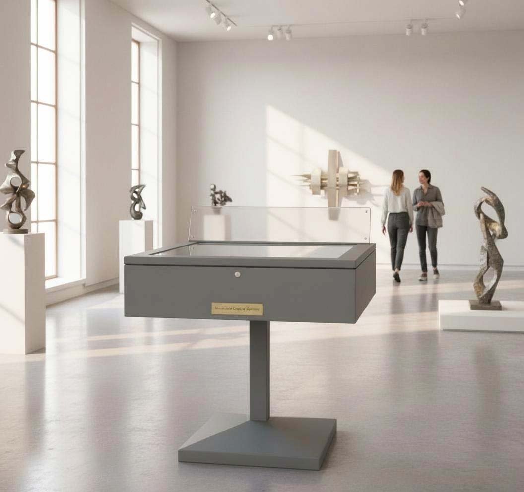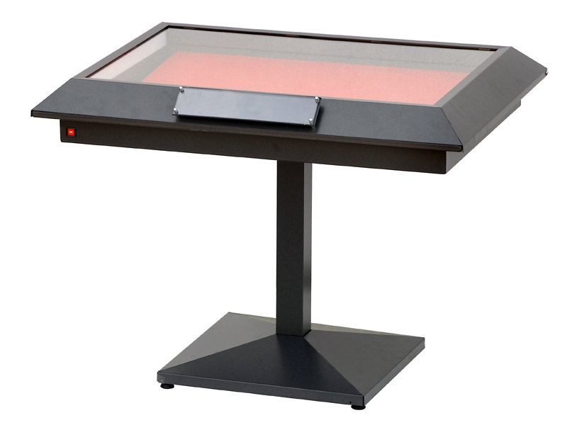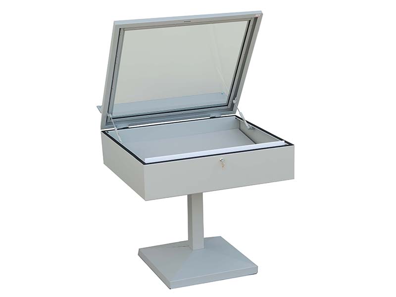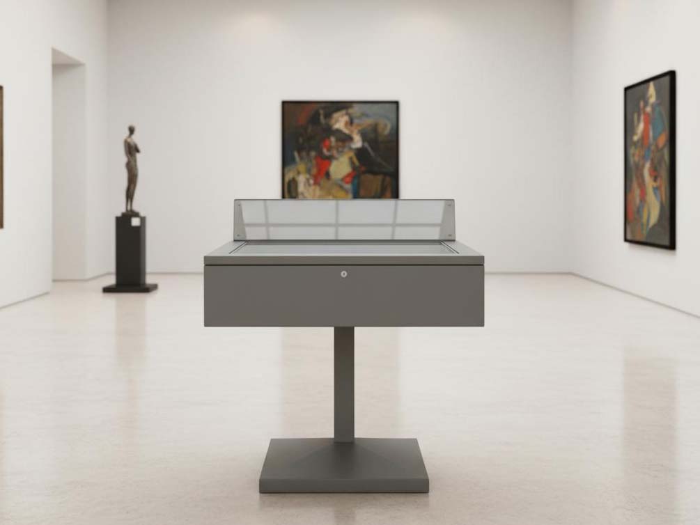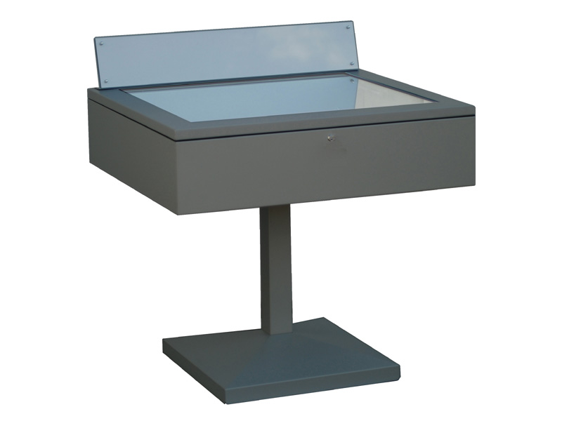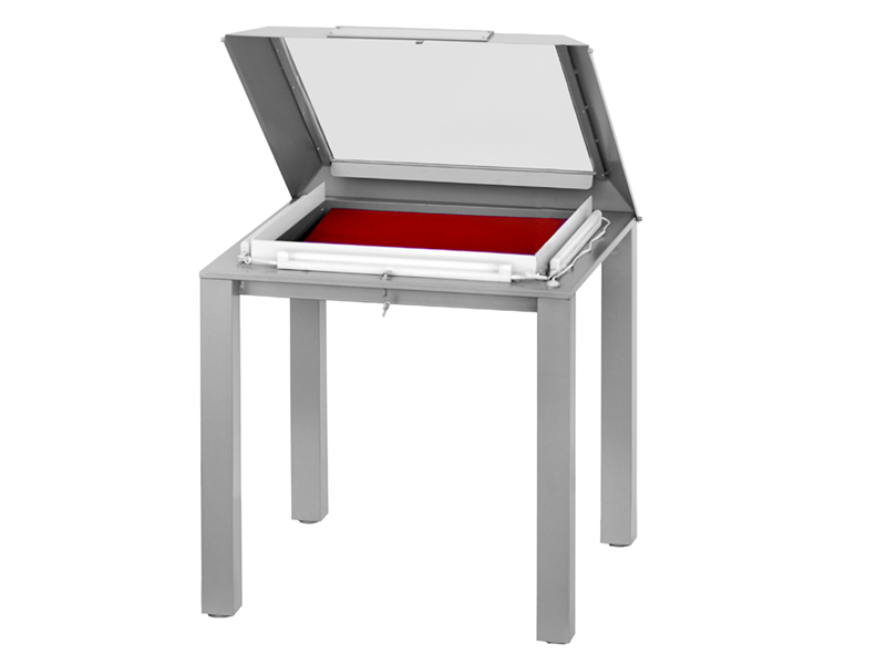 Vetrine espositive della linea testi a tavolo con struttura in acciaio e teca in vetro antinfortunio stratificato. Controllo passivo dell’umidità relativa (silica gel granulare).Le vetrine sono predisposte per impianti di illuminazione a led o fibre ottiche.